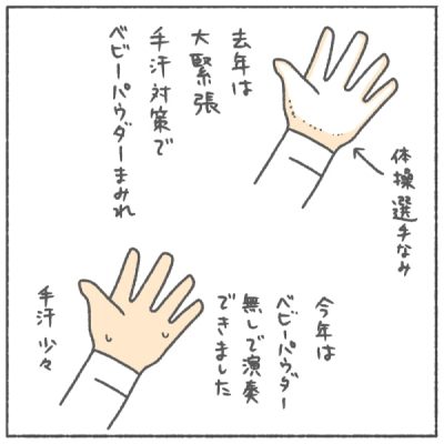 今年は手汗少々だったのでベビーパウダー無しで本番に臨めた。