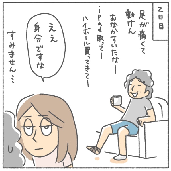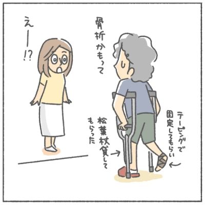 動かないようにテーピングでがっちり固めてもらい、松葉杖を貸してもらって帰宅。
