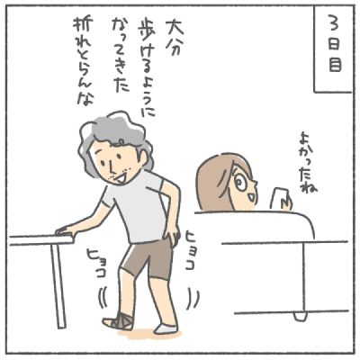 連休3日目の月曜日、痛みは大分おさまり、モノにつかまりながら歩くことができるぐらいまで回復。